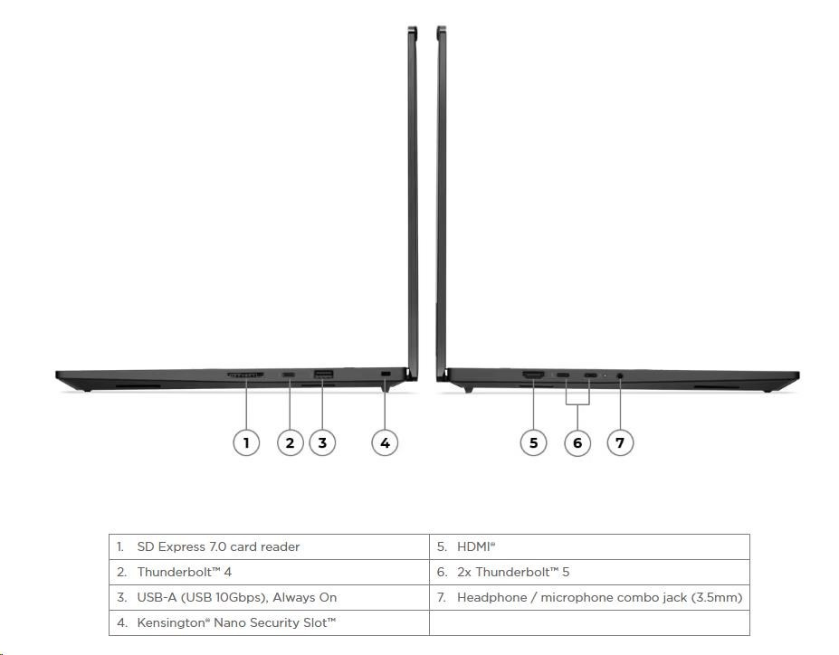| Standartné porty | 1x USB-A (USB 10Gbps / USB 3.2 Gen 2), Always On 2x Thunderbolt™ 5, with USB PD 3.1 and DisplayPort™ 2.1, 140W input / 15W outpu 1x Thunderbolt™ 4, with DisplayPort™ 2.1 and USB PD 3.1, 140W input / 15W output 1x HDMI® 2.1, up to 8K/60Hz 1x Headphone / microphone combo jack (3.5mm) 1x SD Express 7.0 card reader |