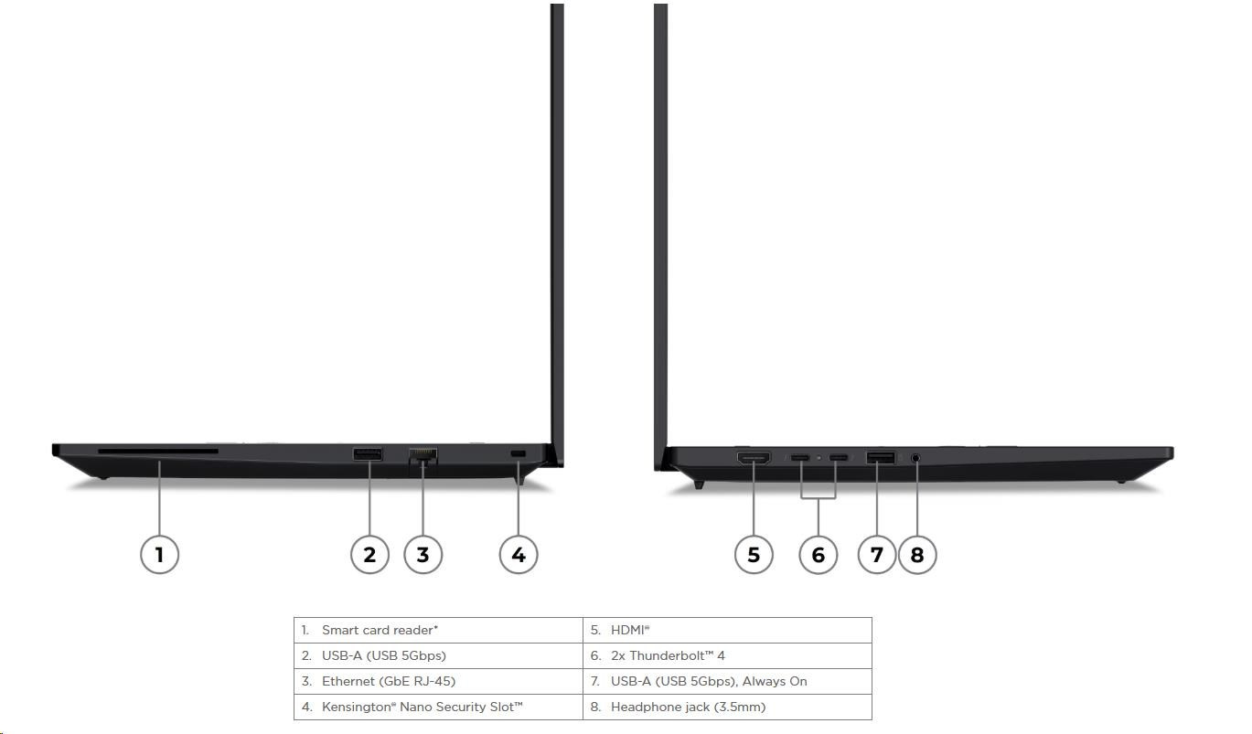 | Standartné porty | 1x USB-A (USB 5Gbps / USB 3.2 Gen 1) 1x USB-A (USB 5Gbps / USB 3.2 Gen 1), Always On 2x Thunderbolt™ 4, with USB PD 3.0 1x HDMI® 2.1, up to 4K/60Hz 1x Headphone / microphone combo jack (3.5mm) 1x Ethernet (GbE RJ-45) 1x Security keyhole 1x Smart Card Reader |