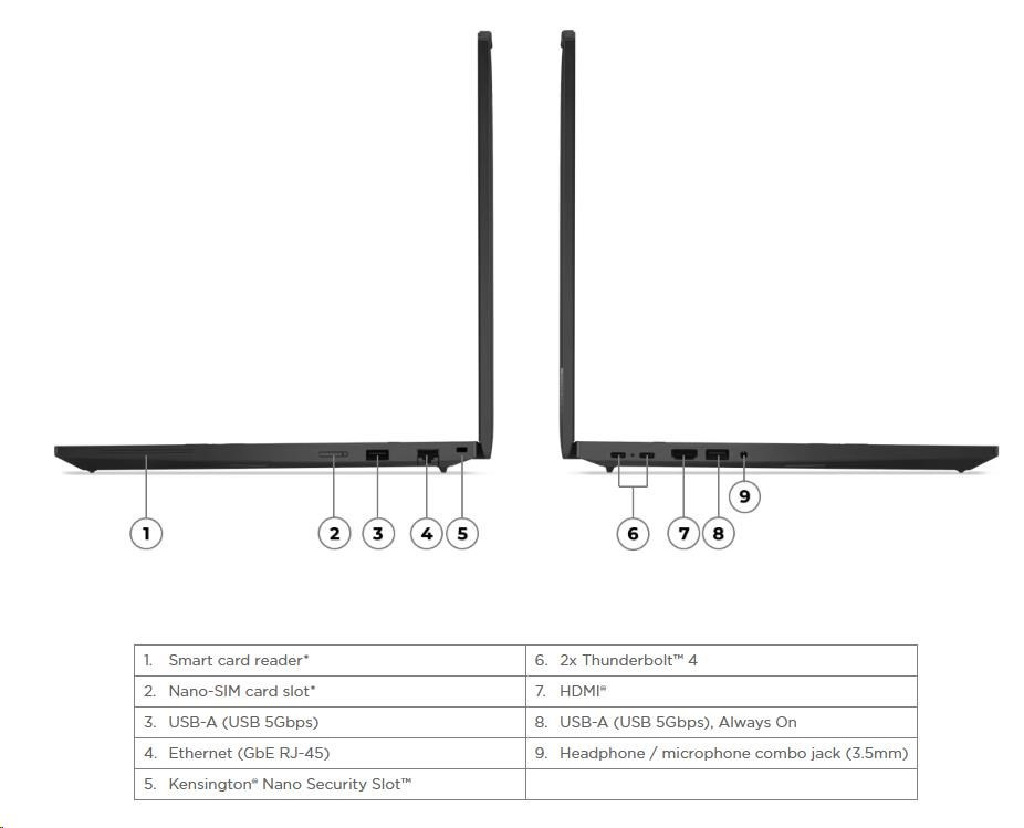 | Standartné porty | 1x USB-A (USB 5Gbps / USB 3.2 Gen 1) 1x USB-A (USB 5Gbps / USB 3.2 Gen 1), Always On 2x USB-C® (Thunderbolt™ 4 / USB4® 40Gbps), with PD 3.0 and DisplayPort™ 1.4 1x HDMI® 2.1, up to 4K/60Hz 1x Headphone / microphone combo jack (3.5mm) 1x Ethernet (RJ-45) 1x Security keyhole |
