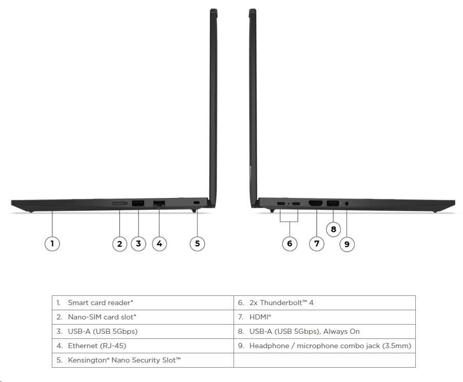 | Standartné porty | 1x USB-A (USB 5Gbps / USB 3.2 Gen 1) 1x USB-A (USB 5Gbps / USB 3.2 Gen 1), Always On 2x USB-C® (Thunderbolt™ 4 / USB4® 40Gbps), with USB PD 3.0 and DisplayPort™ 2.1 1x HDMI® 2.1, up to 4K/60Hz 1x Headphone / microphone combo jack (3.5mm) 1x Ethernet (RJ-45) 1x Smart Card Reader 1x Nano-SIM Card Slot |