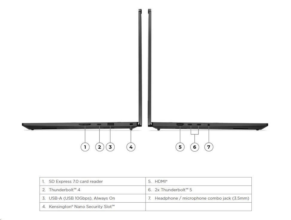 | Standartné porty | 1x USB-A (USB 10Gbps / USB 3.2 Gen 2), Always On 2x Thunderbolt™ 5, with USB PD 3.1 and DisplayPort™ 2.1, 140W input / 15W output 1x Thunderbolt™ 4, with DisplayPort™ 2.1 and USB PD 3.1, 140W input / 15W output 1x HDMI® 2.1, up to 8K/60Hz 1x Headphone / microphone combo jack (3.5mm) 1x SD Express 7.0 card reader |