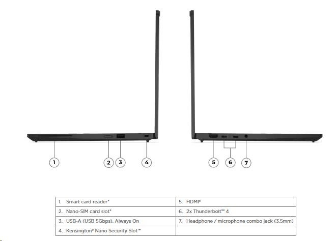 | Standartné porty | 1x USB-A (USB 5Gbps / USB 3.2 Gen 1), Always On 2x USB-C® (Thunderbolt™ 4 / USB4® 40Gbps), with USB PD 3.0 and DisplayPort™ 2.1 1x HDMI® 2.1, up to 4K/60Hz 1x Headphone / microphone combo jack (3.5mm) |