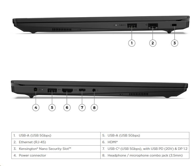 | Standardní porty | 2x USB-A (USB 5Gbps / USB 3.2 Gen 1) 1x USB-C® (USB 5Gbps / USB 3.2 Gen 1), with USB Power Delivery (20V only) and DisplayPort™ 1.2 1x HDMI® 1.4b 1x Headphone / microphone combo jack (3.5mm) 1x Ethernet (RJ-45) 1x Power connector |