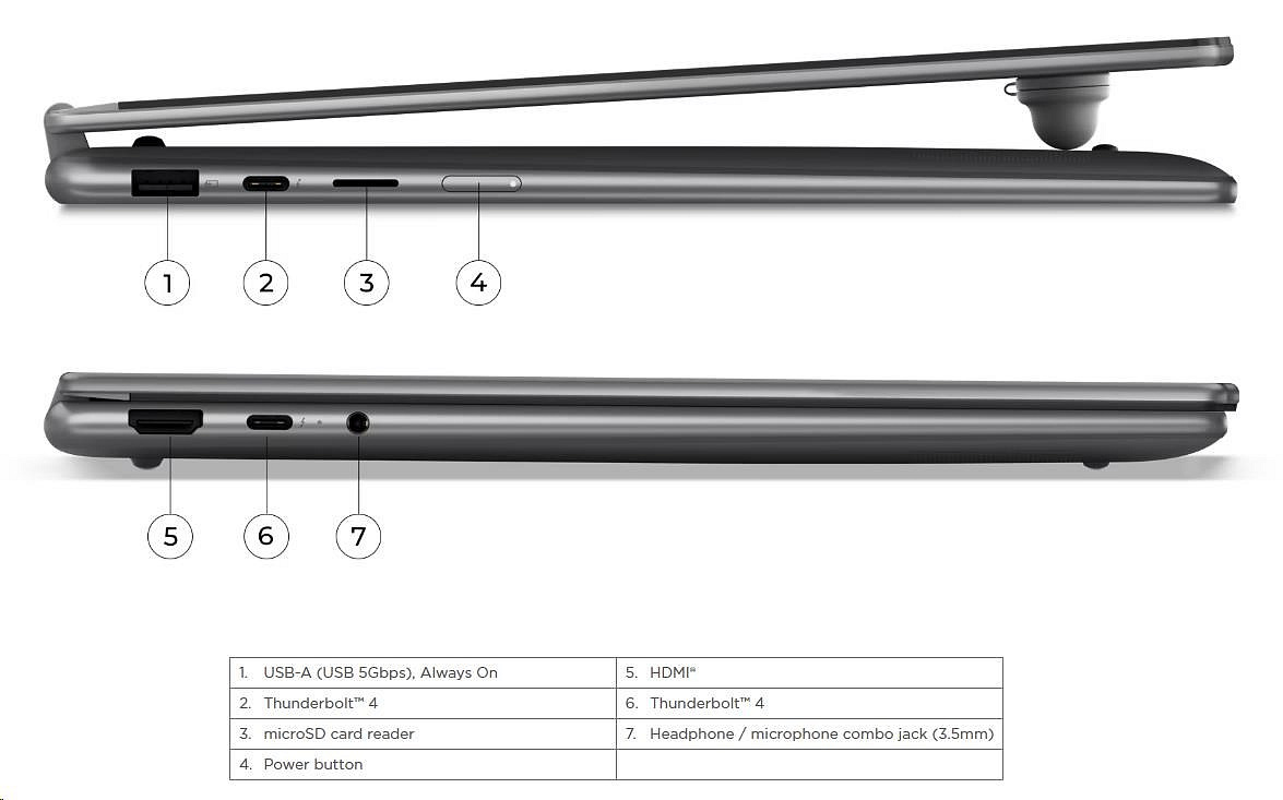 | Standartné porty | 1x USB-A (USB 5Gbps), Always On 2x Thunderbolt™ 4, with USB PD 45-65W and DisplayPort™ 2.1 1x HDMI® 2.1, up to 4K/60Hz 1x Headphone / microphone combo jack (3.5mm) 1x microSD card reader |