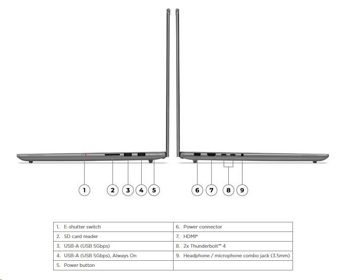 | Standartné porty | 1x USB-A (USB 5Gbps / USB 3.2 Gen 1) 1x USB-A (USB 5Gbps / USB 3.2 Gen 1), Always On 2x USB-C® (Thunderbolt™ 4 / USB4® 40Gbps), with USB PD 65-100W and DisplayPort™ 2.1 1x HDMI® 2.1, up to 8K/60Hz 1x Headphone / microphone combo jack (3.5mm) 1x SD card reader 1x Power connector |