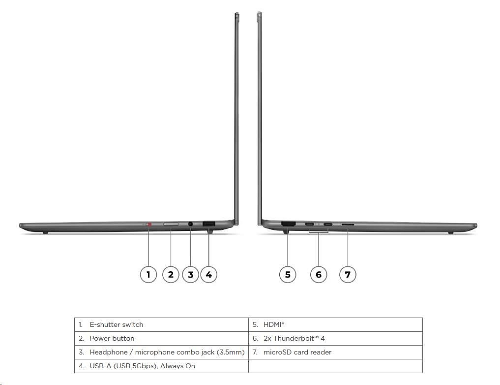 | Standartné porty | 1x USB-A (USB 5Gbps / USB 3.2 Gen 1), Always On 2x USB-C® (Thunderbolt™ 4 / USB4® 40Gbps), with USB PD 3.0 and DisplayPort™ 2.1 1x HDMI® 2.1, up to 4K/60Hz 1x Headphone / microphone combo jack (3.5mm) 1x microSD card reader |