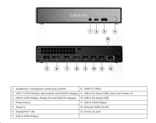 | Predné porty | 1x USB-C® (USB 10Gbps / USB 3.2 Gen 2), with data transfer and 5V@3A charging 1x USB-A (USB 10Gbps / USB 3.2 Gen 2), with Always On and 5V@2.1A charging 1x headphone / microphone combo jack (3.5mm) |