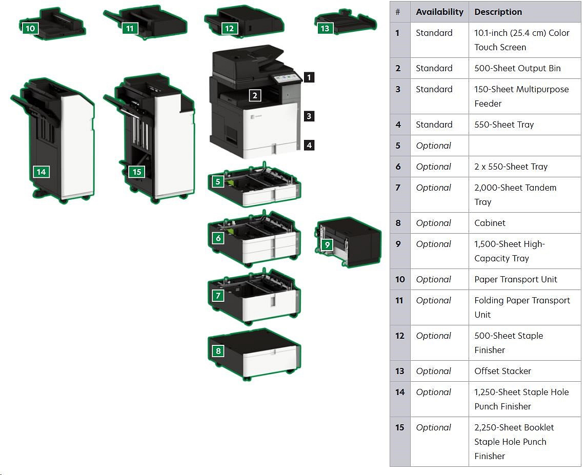 Tlačové technológie:Laserová; Maximálny formát tlače/média:A3; Skutočné rozlíšenie tlačiarne (v DPI):1200x1200; Rozhranie tlačiarne:Sieťové; Maximálna rýchlosť tlače (A4 za minútu):35; Automatická obojstranná tlač (Duplex); Štandardný počet vstupných zásobníkov:2; Maximálny počet vstupných zásobníkov:6; Typ skenera:Plochý.prečítajte si viac