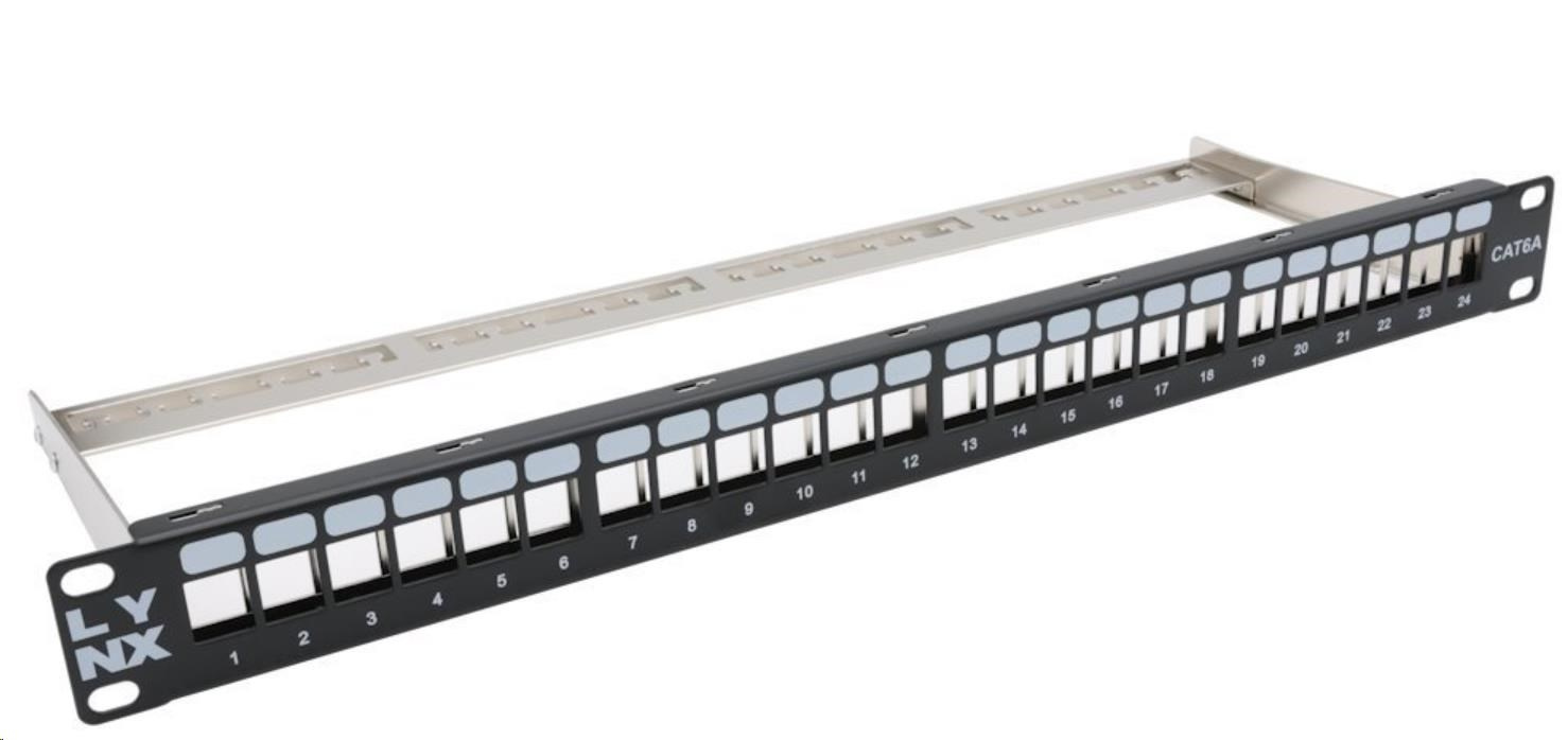 Akčné ponuky na váš e-mailPatch panel 1U/19", 24 otvorov, neosadený, pre tienené keystony, kategória Cat5e/6/6A/7, čierny (predný panel).