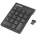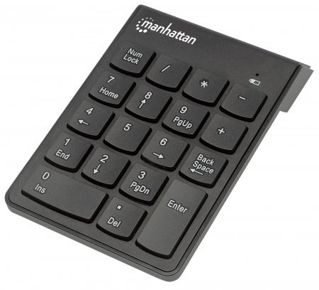 Manhattan Numeric Wireless Keypad enhances any notebook computing experience, especially when inputting important numeric data. The full-size 18-key layout and membrane (full-travel) key-switch technology reduce typing noise, improve response and provide low-profile keystrokes for fast and accurate data entry. A handy backspace key allows swift corrections. The asynchronous number-lock function allows users to simultaneously input letters from the computer's keyboard and numeric data from the keypad. Its USB Wireless Receiver connection, plug-and-play installation and ultra slim, lightweight construction make it easy to pack and travel.