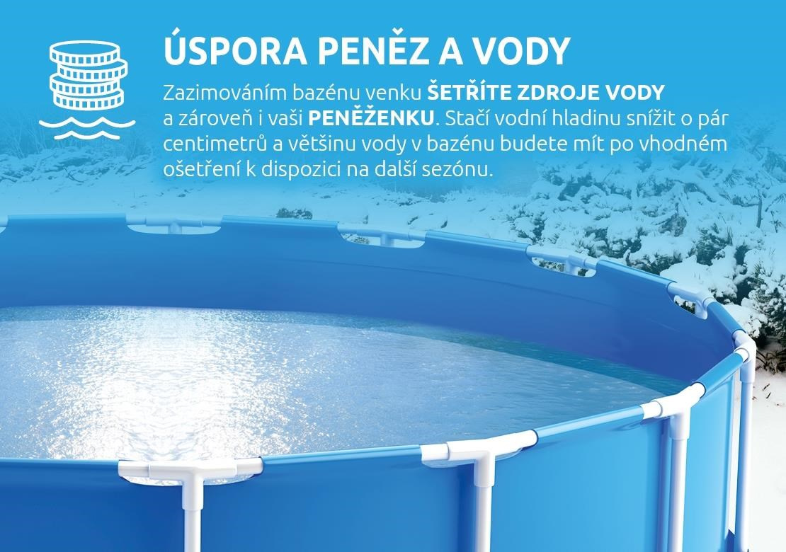 Zazimovaním bazéna vonku sa šetria vodné zdroje a zároveň sa znižujú náklady na vodné a stočné. Vhodne ošetrená bazénová voda vydrží do ďalšej sezóny a nebude potrebné bazén znovu kompletné napúšťať.