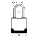 - Visací zámok o šírke 48 mm s telom z laminovanej ocele s povrchovou úpravou odolnou proti poveternostným vplyvom.