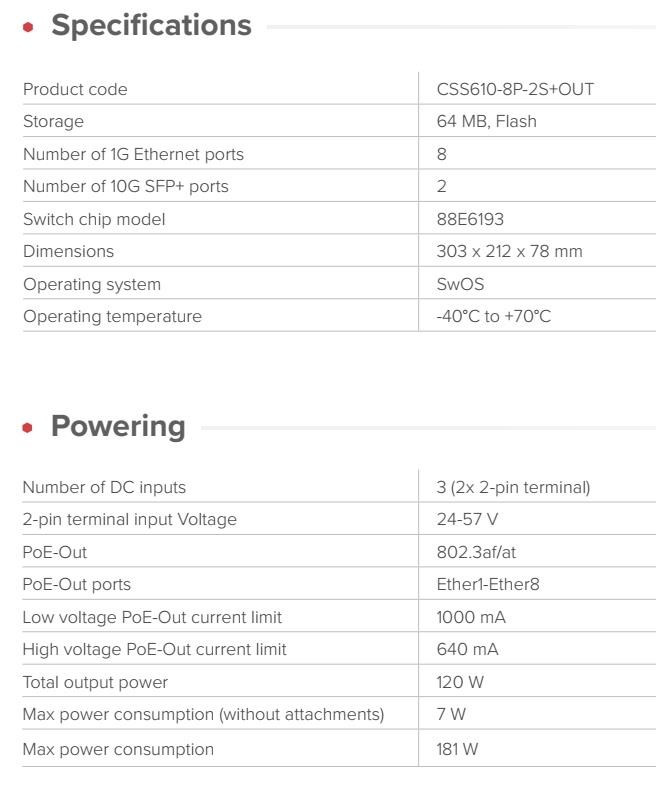 Kompaktní PoE switch s integrovanou UPS a inteligentní nabíječkou baterií – garance bezvýpadkového provozu CCTV kamer a přístupových bodů při výpadích napájení. Výpadky proudu by neměly znamenat prostoje. NetPower Lite 8P poskytuje spolehlivé napájení přes Ethernet i v případě výpadku elektrické sítě. Integrovaná UPS a inteligentní nabíječka spolupracují s vaší externí 24V baterií a mohou poskytovat vysokonapěťový výstup PoE i z nízkonapěťových zdrojů stejnosměrného proudu. netPower je tak ideální volbou pro CCTV, kanceláře, bytové domy a instalace v rámci inteligentních měst. NetPower Lite 8P je vybaven osmi gigabitovými ethernetovými porty s výstupem PoE 802.3af/at a dvěma 10G SFP+ uplinky pro vysokorychlostní backhaul. Používá systém SwOS Lite – rychlý, efektivní a příjemně jednoduchý na správu. SwOS je konfiguratelné z webového prohlížeče, vedle bežných funkcí řiditelných switchů umožňuje například • port-to-port forwarding management • apply MAC filter • configure VLANs • mirror traffic • apply bandwidth limitation • adjust some MAC and IP header fields Napájení je flexibilní, stačí připojit 24–57 V DC do 2-pinového terminálu. Stejně jako naše ostatní zařízení vhodná pro venkovní použití je i tento přepínač konstruován tak, aby vydržel. S provozním rozsahem od –40 °C do +70 °C funguje netPower Lite 8P i tam, kde by mnoho jiných zařízení již selhalo. Přepínač může odebírat až 181 W celkem, s rozpočtem 120 W PoE-Out. Pokud je příchozí výkon omezen, PoE je automaticky upřednostněno – nejprve se zpomalí nabíjení, aby vaše základní zařízení zůstala online. Integrovaná podpora UPS je efektivní, spolehlivá, nabízí různé možnosti : Připojte baterii s nominálním napětím 24 V – obvykle dvě 12V jednotky zapojené do série – a přepínač se okamžitě stane malým, efektivním UPS. Během výpadku napájení zůstávají zařízení PoE online bez jakýchkoli přerušení. Nabíječka podporuje zaplavené, AGM a gelové olověné baterie, stejně jako LiFePO4 (lithium-železo-fosfátové baterie) s příslušným BMS. Subsystém nabíječky je navržen pro nabíjení baterií přes 2pinový konektor v proudovém rozsahu 0,2–1,6 A a napěťovém rozsahu 20–31,7 V. Součástí je teplotní senzor, který jemně ladí napětí pro olověné baterie a blokuje nabíjení, když teploty překročí bezpečný rozsah. To pomáhá prodloužit životnost baterie. Podrobné technické specifikace: Product code: CSS610-8P-2S+OUT Storage: 64 MB, Flash Number of 1G Ethernet ports: 8 Number of 10G SFP+ ports: 2 Switch chip model: 88E6193 Dimensions: 303 x 212 x 78 mm Operating system: SwOS Operating temperature: -40°C to +70°C Napájení: Number of DC inputs: 3 (2x 2-pin terminal) 2-pin terminal input Voltage: 24-57 V PoE-Out: 802.3af/at PoE-Out ports: Ether1-Ether8 Low voltage PoE-Out current limit: 1000 mA High voltage PoE-Out current limit: 640 mA Total output power: 120 W Max power consumption (without attachments): 7 W Max power consumption: 181 W Upozornění: Výrobce MIKROTIK nevztahuje záruku na zařízení poškozená přepětím. Zařízení je třeba na vstupech adekvátně chránit proti indukovanému elektrostatickému přepětí či přepěťovým špičkám na silovém vedení. Při venkovních instalacích je třeba používat stíněnou kabeláž (FTP/SFTP), příslušné přepěťové ochrany (pokud nejsou integrovány) a provést korektní a efektivní uzemnění. Zařízení vždy provozujte s poslední výrobcem publikovanou verzí (výrobcem označenou "Stable") operačního systému RouterOS/SwOS. Taková verze garantuje nejoptimálnější funčknost, obsahuje opravené chyby z verzí předchozích a výkonová vylepšení..
