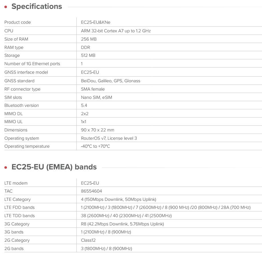 Brána IoT průmyslové třídy s LTE/BLE/GNSS konektivitou pro inteligentní sledování majetku, vzdálené monitorování a efektivní automatizaci. Původně navrženo pro kávovary a prodejní automaty – ideální pro všechny druhy průmyslové automatizace. KNOT Embedded LTE4 je malá, ale výkonná průmyslová LTE brána určená pro integrátory, specialisty na automatizaci a tvůrce systémů IoT. Hodí se do stísněných prostor, montuje se přímo na DIN lištu a poskytuje spolehlivé připojení LTE Cat4 s podporou Bluetooth a GNSS. Použijte ji jako primární bránu, záložní spojení nebo uzel pro sběr dat IoT – vše je poháněno systémem RouterOS pro maximální flexibilitu. Funkce a vlastnosti KNOT Embedded LTE4 je určen pro prostředí, kde je omezený prostor, ale spolehlivost je zásadní: • Infrastruktura inteligentních měst (parkování, senzory, měření) • Monitorování kávovarů a prodejních automatů • Skříně pro průmyslovou automatizaci • Monitorování životního prostředí a veřejných služeb • Sledování vozidel nebo majetku pomocí GNSS • Prodejní kiosky, platební terminály, digitální značení • Záložní připojení LTE pro stávající zařízení Ethernet • Brány IoT pro senzory a majáky BLE Upozornění: IoT brána není plnohodnotným LTE routerem. SIM karta není určená pro vytáčení připojení, ale pro komunikaci v síti IoT. IoT brána nedisponuje LTE modemem. Technické specifikace: Product code: EC25-EU&KNe CPU: ARM 32-bit Cortex A7 up to 1.2 GHz Size of RAM: 256 MB RAM type: DDR Storage: 512 MB Number of 1G Ethernet ports: 1 GNSS interface model: EC25-EU GNSS standard: BeiDou, Galileo, GPS, Glonass RF connector type: SMA female SIM slots: Nano SIM, eSIM Bluetooth version: 5.4 MIMO DL: 2x2 MIMO UL: 1x1 Dimensions: 90 x 70 x 22 mm Operating system: RouterOS v7, License level 3 Operating temperature: -40°C to +70°C Napájení: Number of DC inputs: 2 (PoE-In, USB Type-C (powering only)) PoE-In input Voltage: 12-57 V USB Type-C input voltage: 5 V Power adapter nominal voltage: 5 V Power adapter nominal current: 0.8 A PoE-in: 802.3af/at Max power consumption: 7 W EC25-EU (EMEA) podporovaná pásma: LTE modem: EC25-EU TAC: 86554604 LTE Category: 4 (150Mbps Downlink, 50Mbps Uplink) LTE FDD bands: 1 (2100MHz) / 3 (1800MHz) / 7 (2600MHz) / 8 (900 MHz) /20 (800MHz) / 28A (700 MHz) LTE TDD bands: 38 (2600MHz) / 40 (2300MHz) / 41 (2500MHz) 3G Category: R8 (42.2Mbps Downlink, 5.76Mbps Uplink) 3G bands: 1 (2100MHz) / 8 (900MHz) 2G Category: Class12 2G bands: 3 (1800MHz) / 8 (900MHz) Internet věcí (anglicky Internet of Things, zkratka IoT) je termínem pro moderní přístroje ovladatelné i na dálku pomocí internetu. Snadno je tak obsloužíte pomocí svého chytrého telefonu nebo je jednoduše připojíte k centrální jednotce. Umožní tak snadno zautomatizovat věci, o které byste se jinak museli postarat sami. Jedná se o technologický koncept umožňující realizaci takzvaného "inteligentního domu" (automatické zhasínání světel, ovládání vytápění apod.). Umožňuje řídit klimatizaci, vyhřívání vašeho bazénu, ohřev vody, pečovat o vaše akvárium, obsluhovat nastavení alarmu či mechanických zámků. Pokud si nejste jistí, zda jste v ranním shonu vypnuli žehličku, můžete na dálku odpojit od sítě jednotlivé zásuvky. Vaše lednička vás dokáže upozornit na chybějící potraviny a připravovat aktualizovaný nákupní seznam. Upozornění Výrobce Mikrotik neposkytuje záruku na zařízení poškozená přepětím. Zařízení je třeba adekvátně chránit proti indukovanému elektrostatickému přepětí či přepěťovým špičkám na silovém vedení. Pro venkovní instalace používat výhradně stíněnou kabeláž (FTP/SFTP), jednotky korektně uzemnit (užití integrovaného zemnícího členu, ethernetové přepěťové ochrany). Zařízení vždy provozujte s poslední výrobcem publikovanou verzí (výrobcem označenou "Stable") operačního systému RouterOS. Taková verze garantuje nejoptimálnější funčknost, obsahuje opravené chyby z verzí předchozích a výkonová i funční vylepšení..