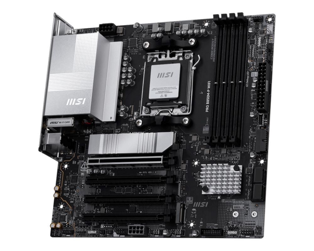 Akčné ponuky na váš e-mailPRO B850M-P WIFI offers a simple design with a harmonious silver color scheme that perfectly matches both white and black PC builds. It is engineered with many exclusive features of MSI, a Wi-Fi 7 with EZ Antenna, 5G LAN, PCIe 5.0 M.2 with EZ M.2 Shield Frozr II, and Supplemental PCIe Power, ready for the AMD Ryzen™ 9000 series processors.