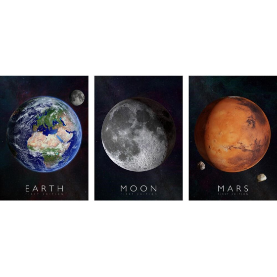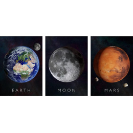 Balenie obsahuje 3 plagáty: Zem, Mesiac a Mars. Plagáty sú tlačené na odolnom papieri vo veľkosti A1 (594 × 841 mm).