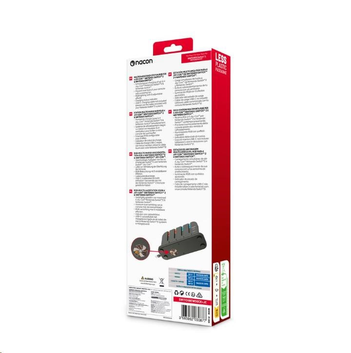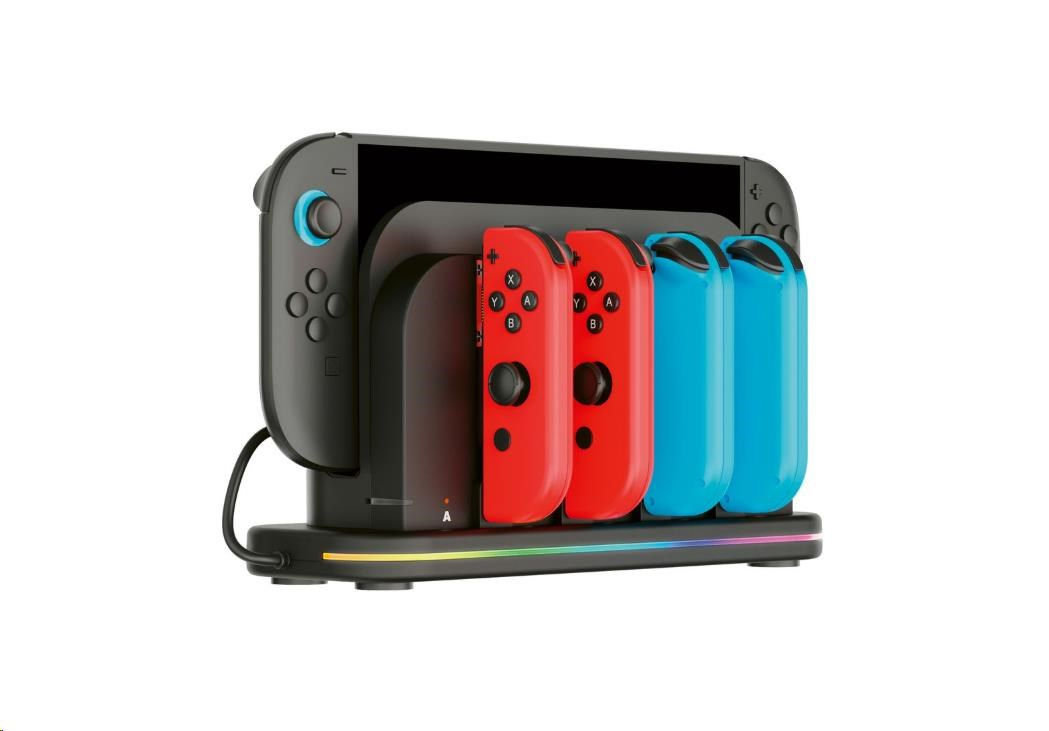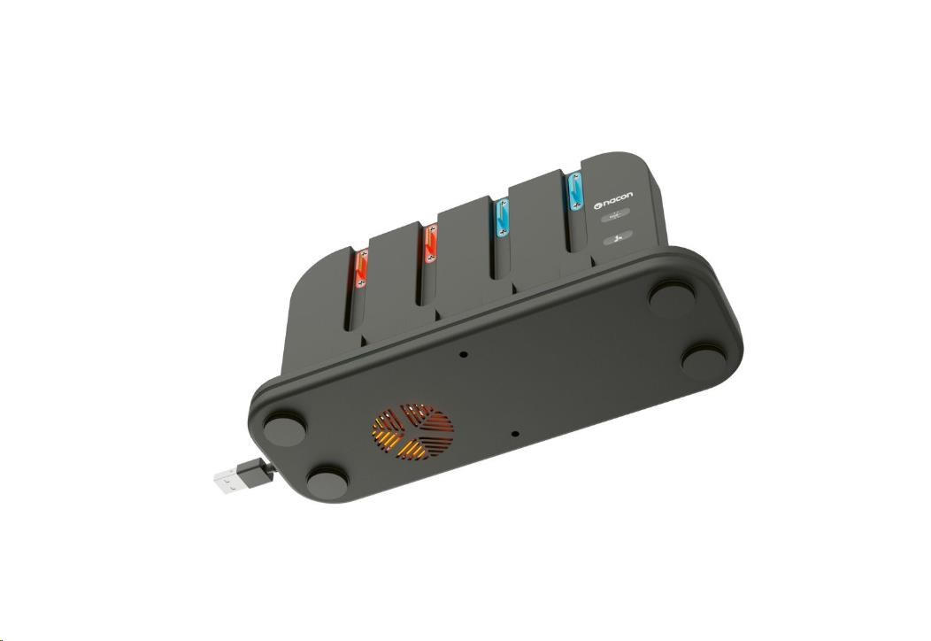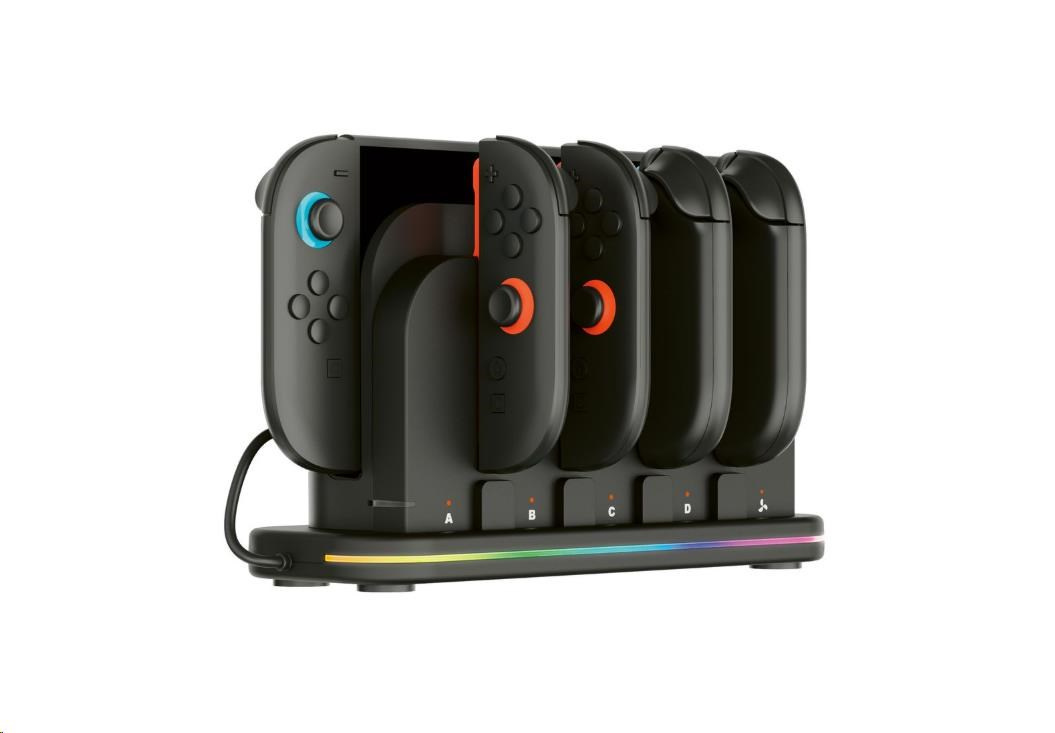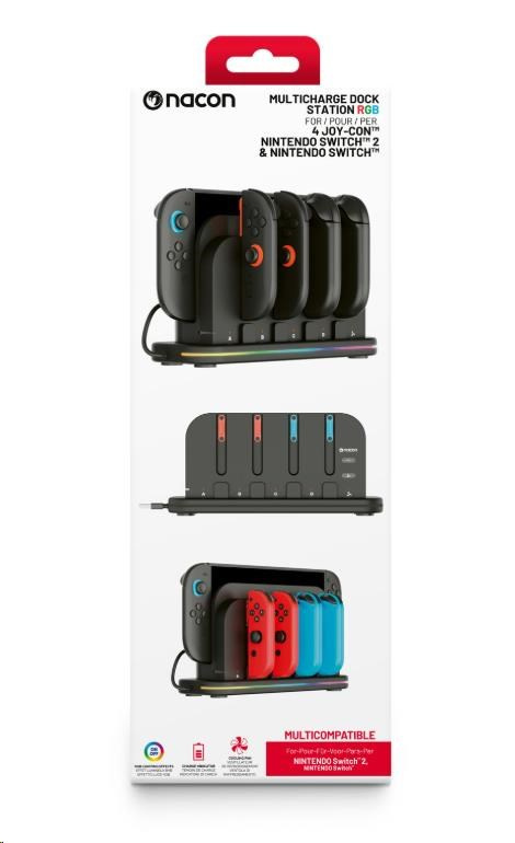 Akčné ponuky na váš e-mailTato nabíjacía dokovacia stanica od spoločnosti Nacon príde vhod všetkým majiteľom novej hernej konzoly Nintendo Switch 2 aj pôvodnej hernej konzoly Nintendo Switch, ktorí často potrebujú nabíjať väčší počet ovládačov Joy-Con. Stanica umožňuje nabíjať súčasne až štyri ovládače, ako aj samotnú konzolu, jejmuž prehriatiu zabraňuje zabudovaný chladený ventilátor. O stave nabíjania každého z ovládačov informuje príslušný LED ukazovateľ, zatiaľ čo RGB pruh s výberom z deviatich rôznych efektov dodáva stanici štýlový, moderný vzhľad. Pretože napájací USB-C kábel nie je súčasťou balenia, slúži na pripojenie stanice do elektrickej siete originálne napájacie príslušenstvo dodávané s konzolou.