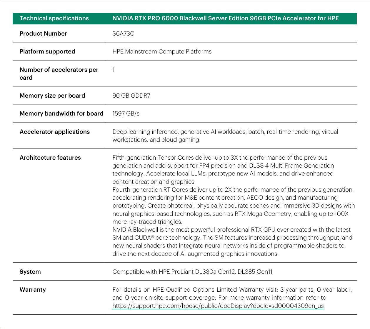 NVIDIA RTX PRO 6000 Blackwell Server Edition 96GB PCIe Accelerator for HPE.