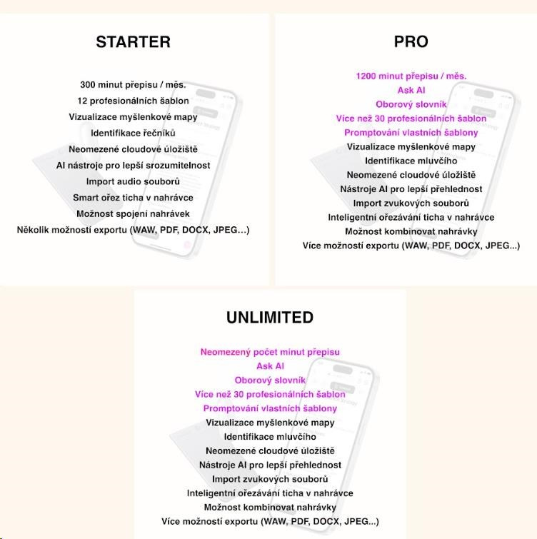 Pro přepis, sumarizaci a další funkce záznamníku Plaud je k dispozici služba Plaud AI membership. Pokud vám stačí 300 a méně, můžete pokračovat s plánem Starter, který je zdarma a nabízí prakticky všechny funkce. Pokud potřebujete více, je pro vás plán Pro s 1200 minutami přepisu a přístupem k experimentálním funkcím jako je identifikace mluvčího nebo překladač, které se v aplikaci budou průběžně objevovat. Oba plány nabídnou 10000 minut cloudového úložiště a AI potlačením šumu.