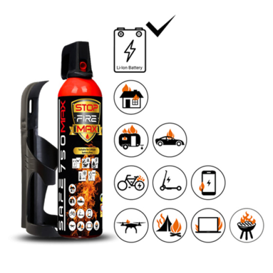 SAFE 750 MAX však ponúka oveľa viac. Je jedným z mála hasicích prostriedkov na trhu, ktorý dokáže účinne hasiť aj začínajúce požiare lítiových batérií. Tieto batérie sú dnes bežnou súčasťou mnohých produktov, ako sú vysávače, elektrokola, elektrokolobežky, drony, telefóny, počítače a ďalšie elektronické zariadenia.