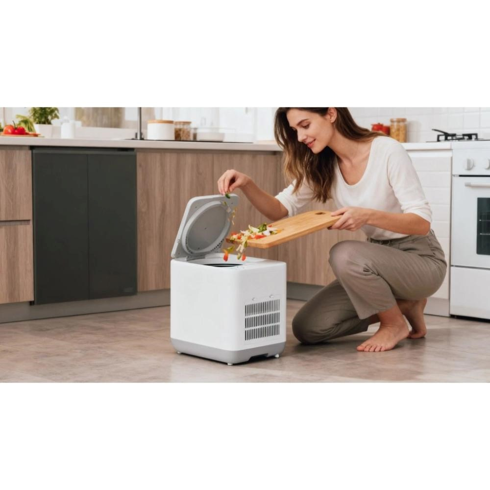 Vzhledem k rozměrům 33 × 25,7 × 33,4 cm (při hmotnosti 7,8 kg) se zařízení vejde prakticky do každé kuchyně, aniž by překáželo při běžných činnostech. Jeho hlučnost je jen 50 dB, což je srovnatelné třeba s běžným ruchem v kanceláři – ekologické zpracování bioodpadu tedy neruší sousedy ani spící děti.