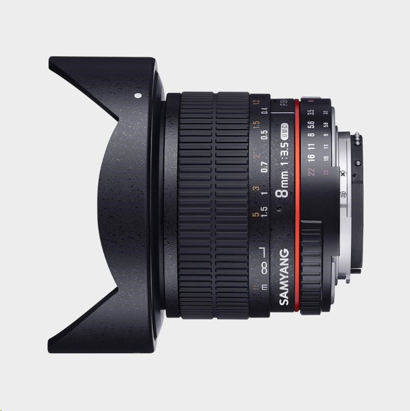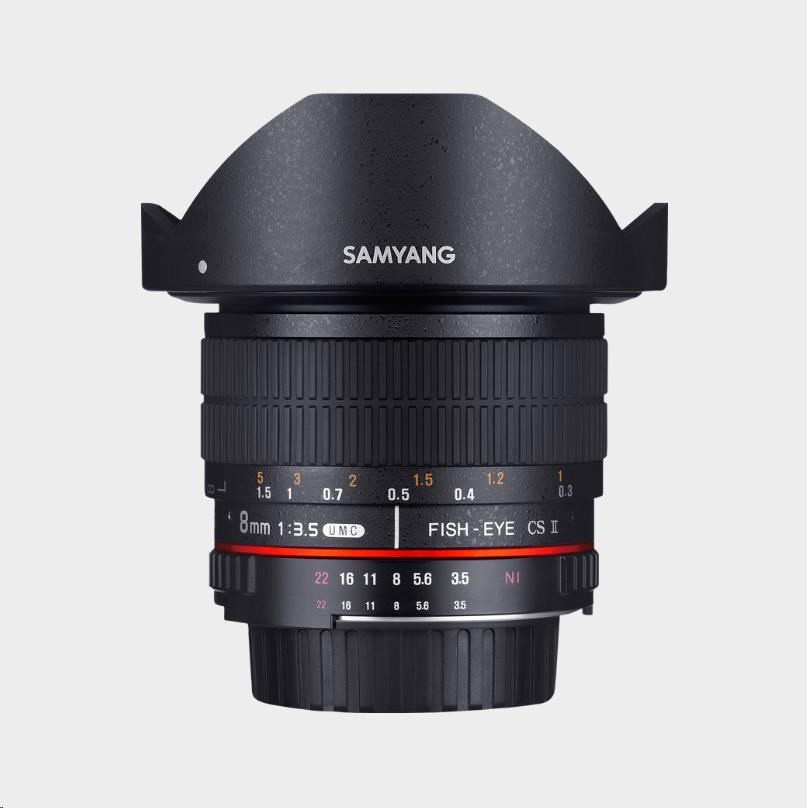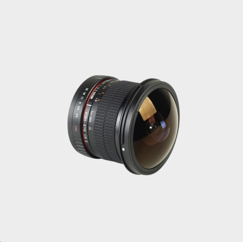 Akčné ponuky na váš e-mailObjektív Samyang 8mm f/3.5 UMC Fish-Eye CS II je špeciálne navrhnutý pre digitálne DSLR s APS-C snímačom, ale môže byť použitý aj na full frame fotoaparátoch s odstránenou slnečnou clonou z objektívu. Na full frame fotoaparátoch poskytuje Samyang 8mm f/3.5 Fish-Eye široké zorné pole, čo je ideálne pre panoramatické snímky a 3D virtuálne prehliadky.