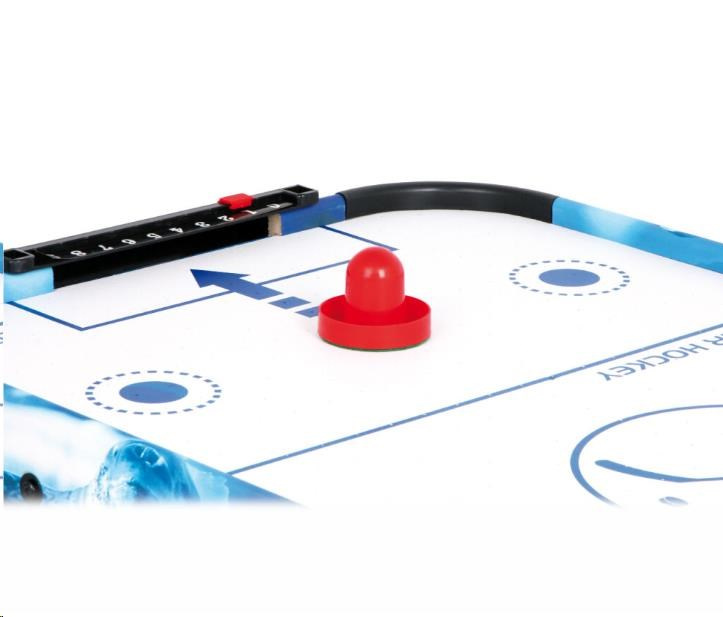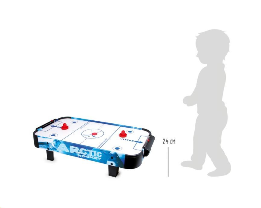 Akčné ponuky na váš e-mailPopulárny vzdušný hokej preverí pohľad a rýchlosť detí. Vďaka vzduchu vháňanému zospodu zabudovaným ventilátorom môže puk hladko, ale hlavne bleskurychle kĺzať po hernej ploche. Hráči majú k dispozícii kuželové palice, ktorými sa snažia vsrieť puk do súperaovej bránky. Palice sú na spodnej strane opatrené filcom pre jednoduchý a tichý pohyb. Bránka každého z hráčov je vybavená jednoduchým číselníkom na zaznamenávanie priebehu zápasu. Hru možno vďaka jej veľkosti ľahko odložiť, prenášať, alebo aj vziať na cesty. Napájanie je zabezpečené adaptérom so štandardnou európskou zástrčkou na 220–240 V. Výrobok vyžaduje montáž, dodávaný s obrázkovým návodom na zostavenie.