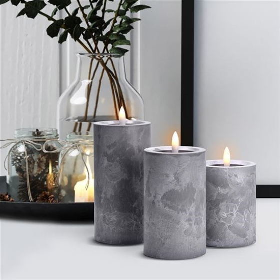 Akčné ponuky na váš e-mailVytvořte si elegantní atmosféru s LED svíčkami s efektem přirozeně blikajícího plamene a luxusním dekorem šedého mramoru. Tato sada tří svíček vnese do vašeho interiéru moderní a útulný vzhled bez nebezpečí otevřeného ohně.