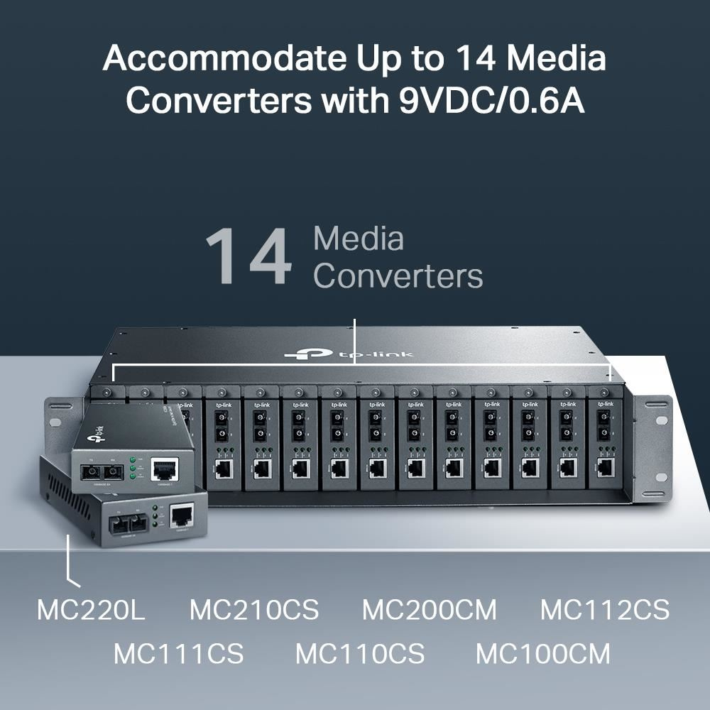 Akčné ponuky na váš e-mailRackový chassis Omada MC1400 se 14 sloty je speciálně navrženo pro umístění 14 mediálních konvertorů Omada, což umožňuje centrální napájení a šetří místo a kabely. Pro nepřetržitý provoz ve vláknové komunikaci je chassis vybaveno volitelným redundantním napájecím zdrojem a funkcí Hot-Swapping, díky které lze instalovat/odstraňovat konvertory bez vypnutí chassis. K stabilizaci výkonu a prodloužení životnosti jsou uvnitř instalovány dva chladiče. Spolu s mediálními konvertory Omada řady MC Gigabit / Fast Ethernet je MC1400 ideálním řešením pro vaši síť mediální konverze. * Pro tp-link mediální konvertory podporuje MC1400 verze MCXXX ver:2.0 a vyšší, ne verze 1.0. ** MCRP100 lze použít jako modul napájení pro MC1400. Každý MCRP100 je vybaven chladičem.