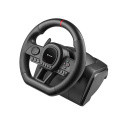 Súčasťou zariadenia je manuálna prevodovka a modul s pedálmi – plynom, brzdou a spojkou, ktoré spoločne vytvárajú autentický pocit riadenia ako vo skutočnom vozidle. Vďaka perforovanému gumovému povrchu volant skvele padne do ruky a pri rýchlych manévroch neklouže. Pre ešte väčšie pohodlie je možné zariadenie upevniť pomocou prísaviek, čo zabezpečí stabilitu aj pri intenzívnom hraní. Tlačidlá pre ovládanie a 8-smerný analogový D-pad sú chytre umiestnené priamo na volante pre okamžitú reakciu počas pretekov.