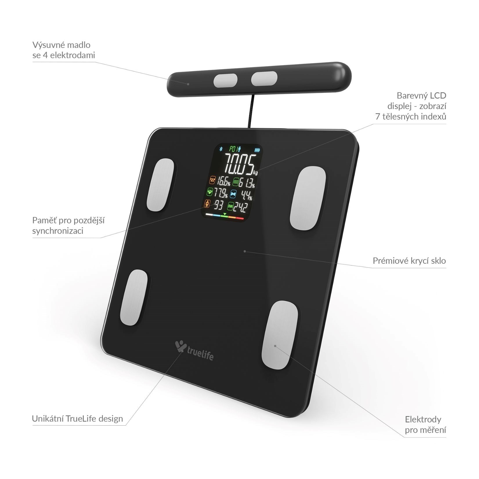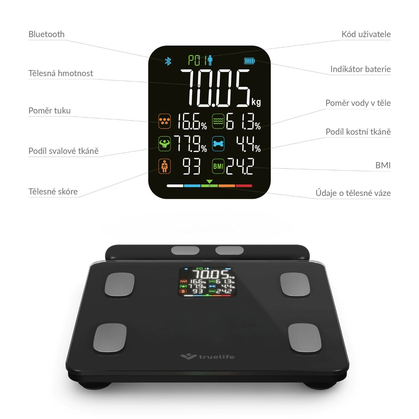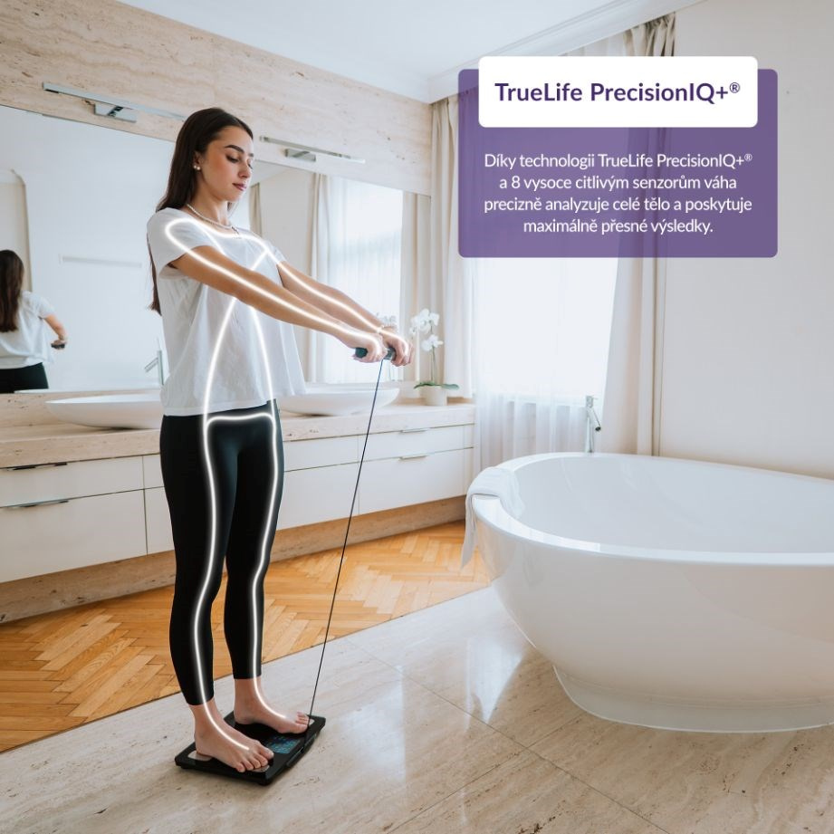Akčné ponuky na váš e-mailZistite o svojom tele viac než len pouhú hmotnosť. Každý sme originál a jedinečnú skladbu má aj naše telo, preto o ňom chytrá váha TrueLife FitScale W8 BT Čierna prezradí detaily. Technológia TrueLife PrecisionIQ+® využíva 8 vysoko citlivých senzorov a s pomocou bioelektrickej impedančnej analýzy zmeria celkovú telesnú skladbu. Na prehľadnom farebnom LCD displeji zobrazí celkom 7 údajov - okrem hmotnosti aj percento tuku, svalov či vody. Prepojením cez Bluetooth s aplikáciou získate prehľadný report zahŕňajúci 15 telesných indexov vrátane ich popisu. Váha je schopná sledovať až 16 používateľov, u ktorých v aplikácii zaznamená 15 posledných meraní. Každého používateľa automaticky rozpozná, takže nie je potrebné nič prepínať. Ktokoľvek má však možnosť použiť váhu aj bez aplikácie. Prémiové tvrdené krycie sklo je elegantné a veľmi odolné s nosnosťou až 180 kg. Pri vážení si môžete zvoliť jednotky, a to buď kilogramy alebo libry. Vážacia odchýlka činí len 0,1 kg, takže vaše výsledky budú naozaj presné.
