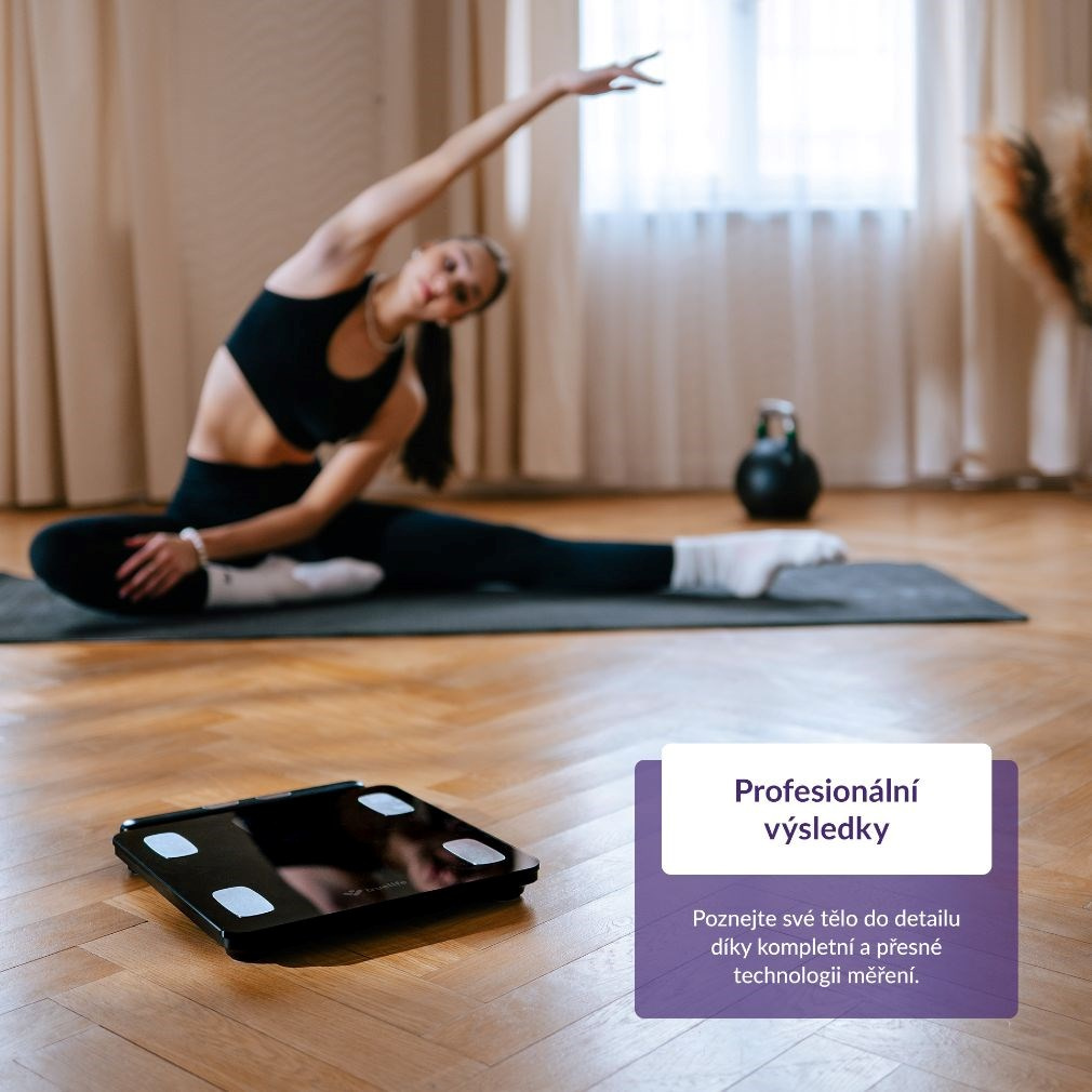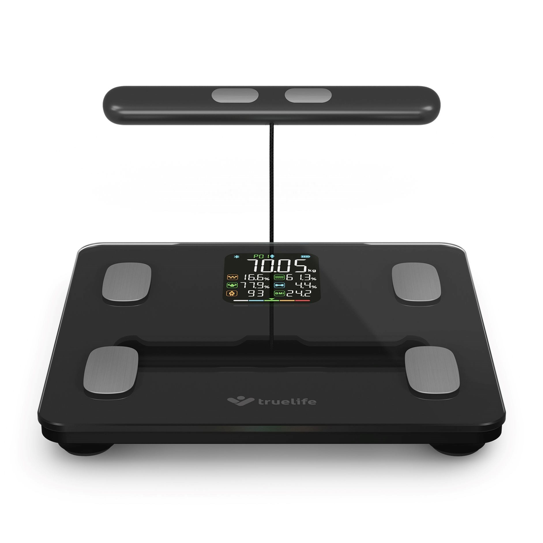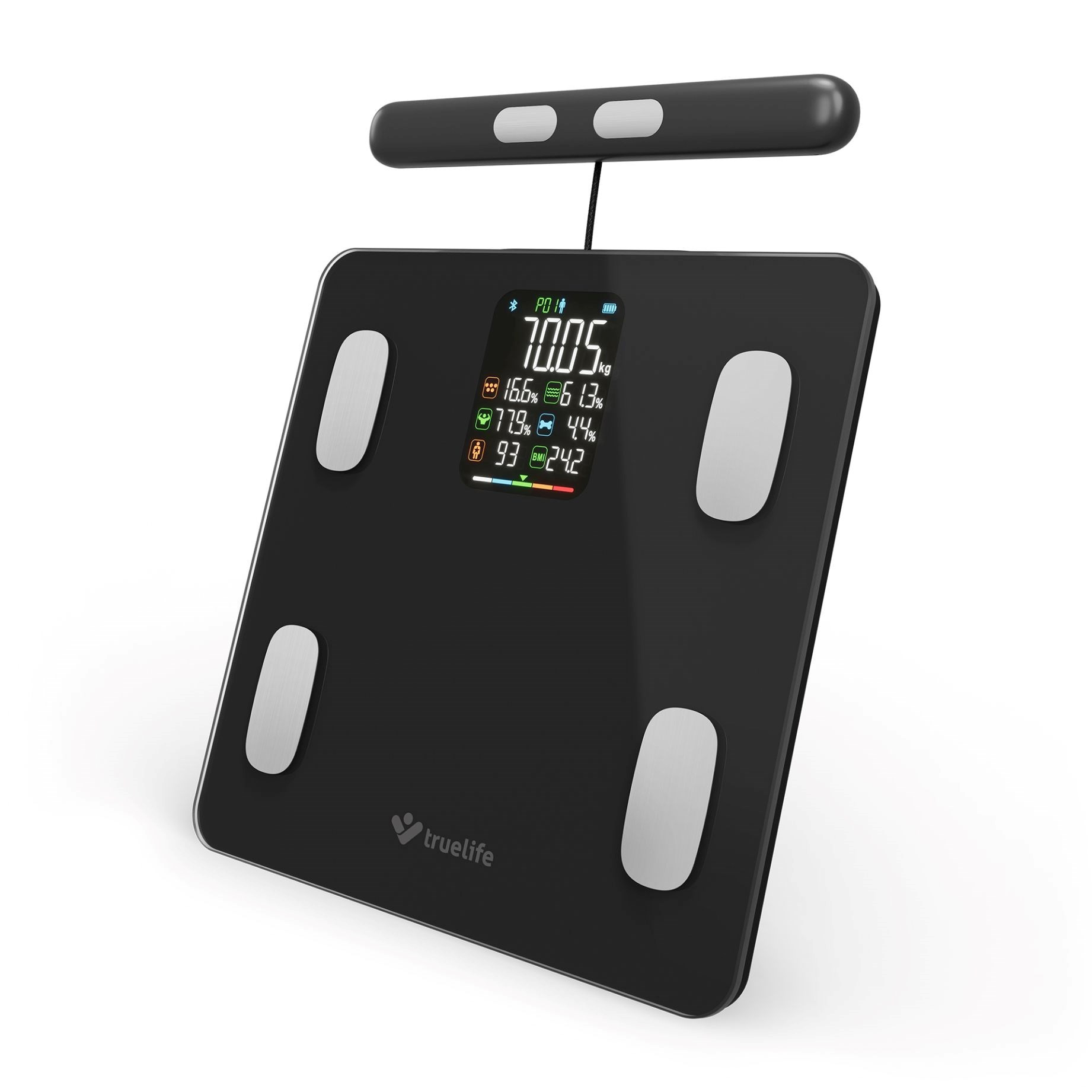 Akčné ponuky na váš e-mailZistite o svojom tele viac než len pouhú hmotnosť. Každý sme originál a jedinečnú skladbu má aj naše telo, preto o ňom chytrá váha TrueLife FitScale W8 BT Čierna prezradí detaily. Technológia TrueLife PrecisionIQ+® využíva 8 vysoko citlivých senzorov a s pomocou bioelektrickej impedančnej analýzy zmeria celkovú telesnú skladbu. Na prehľadnom farebnom LCD displeji zobrazí celkom 7 údajov - okrem hmotnosti aj percento tuku, svalov či vody. Prepojením cez Bluetooth s aplikáciou získate prehľadný report zahŕňajúci 15 telesných indexov vrátane ich popisu. Váha je schopná sledovať až 16 používateľov, u ktorých v aplikácii zaznamená 15 posledných meraní. Každého používateľa automaticky rozpozná, takže nie je potrebné nič prepínať. Ktokoľvek má však možnosť použiť váhu aj bez aplikácie. Prémiové tvrdené krycie sklo je elegantné a veľmi odolné s nosnosťou až 180 kg. Pri vážení si môžete zvoliť jednotky, a to buď kilogramy alebo libry. Vážacia odchýlka činí len 0,1 kg, takže vaše výsledky budú naozaj presné.