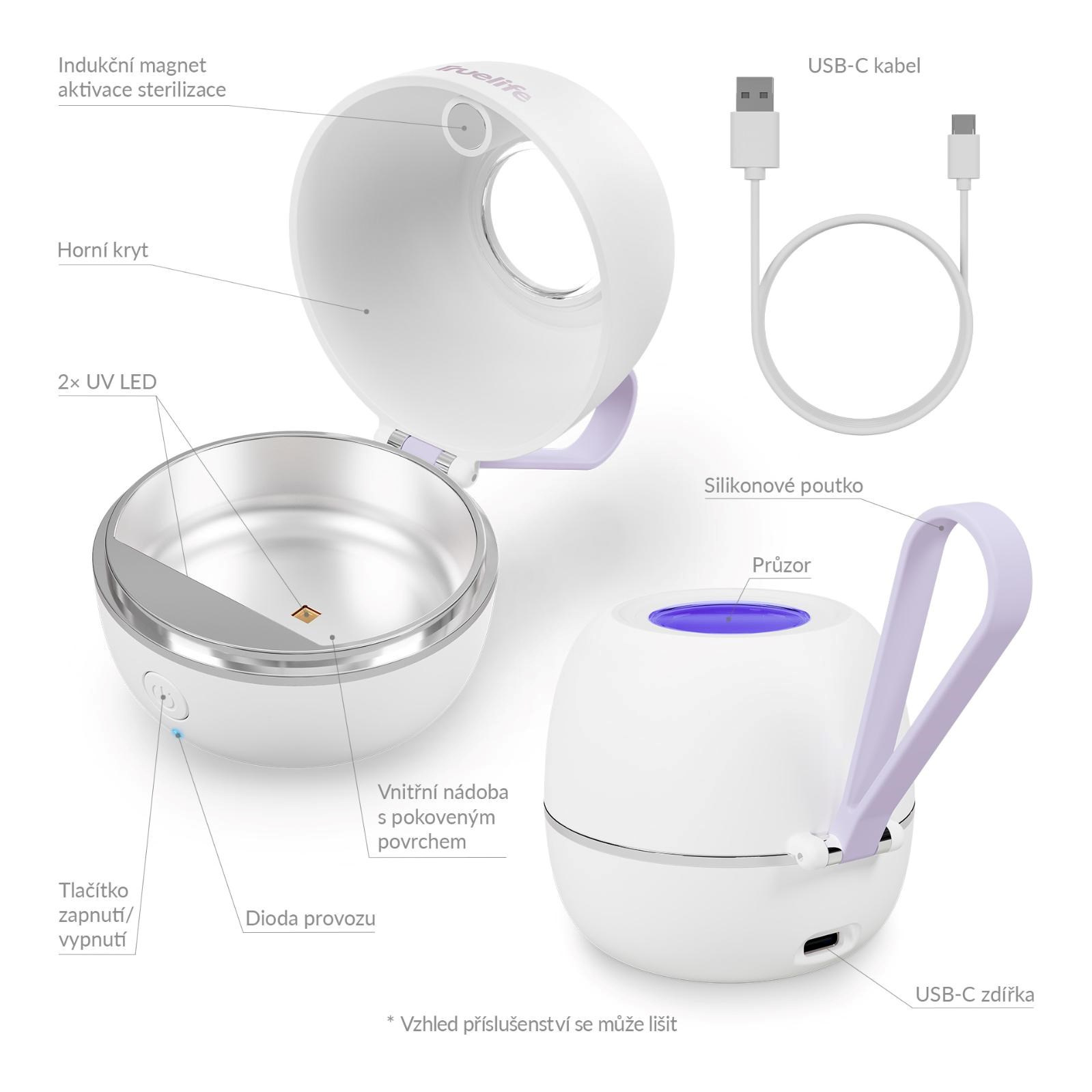 Dve UV-C LED diódy spolu s pokoveným vnútrom zabezpečujú rovnomerné pôsobenie svetla, takže počas chvíle spoľahlivo zničí až 99,9 % baktérií a vírusov na povrchu cumlíka.