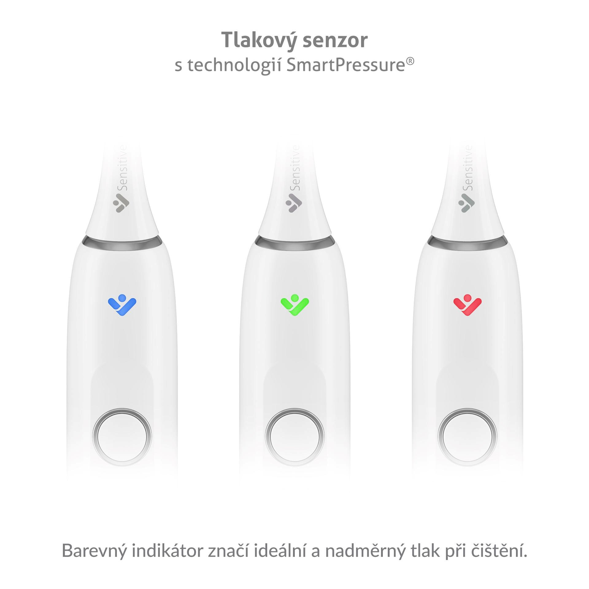 Technológia SmartPressure® sleduje tlak, akým na zuby a ďasná pôsobíte, a farebne vás navedie k ideálnemu čisteniu. Modrá značí optimálny tlak, zelená maximum, a pri červenom svetle vás kefka prerušenými vibráciami upozorní, že je čas zvoľniť. Vďaka tomu, že je indikátor viditeľný ako spredu, tak aj zozadu kefky, máte v zrkadle vždy jasnú kontrolu nad svojou technikou čistenia a tým aj nad zdravím celej ústnej dutiny. Sonická technológia SonicTrue® potom pomocou jemných vibrácií a mikrobubliniek čistí aj horšie prístupné miesta, a pritom zostáva šetrná k zubnej sklovine aj citlivým ďasnám.