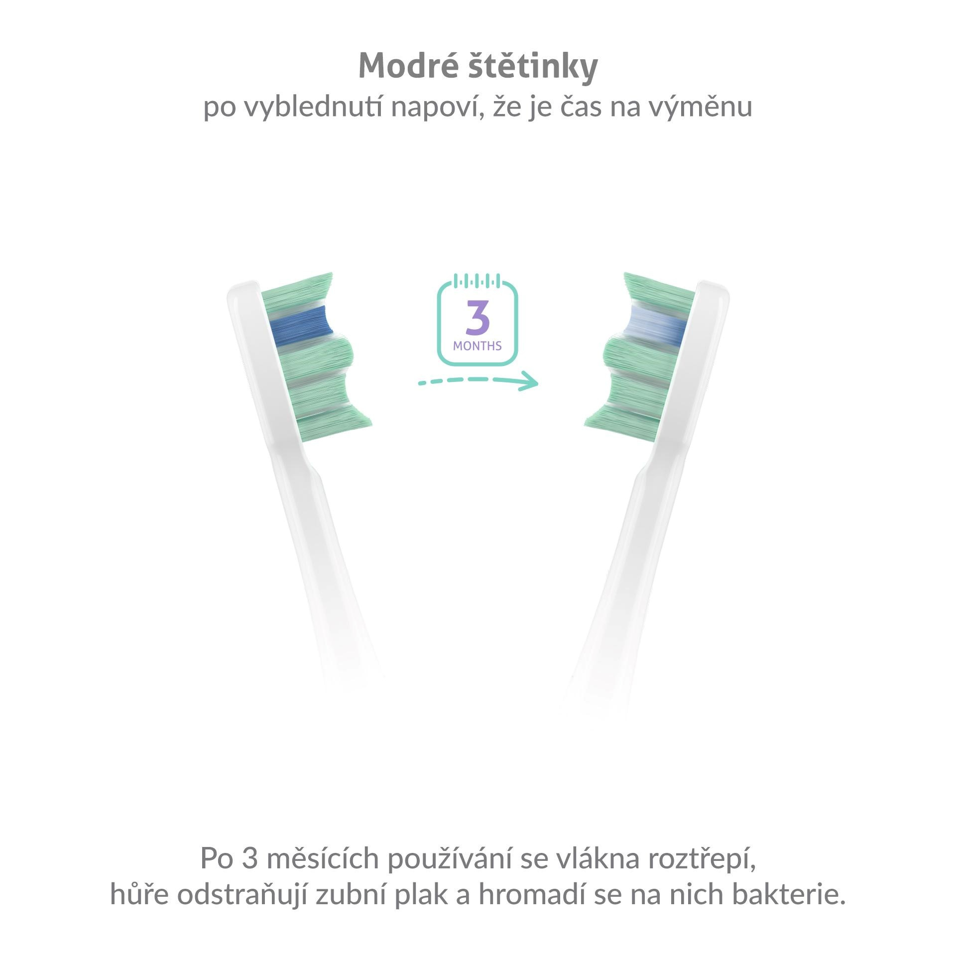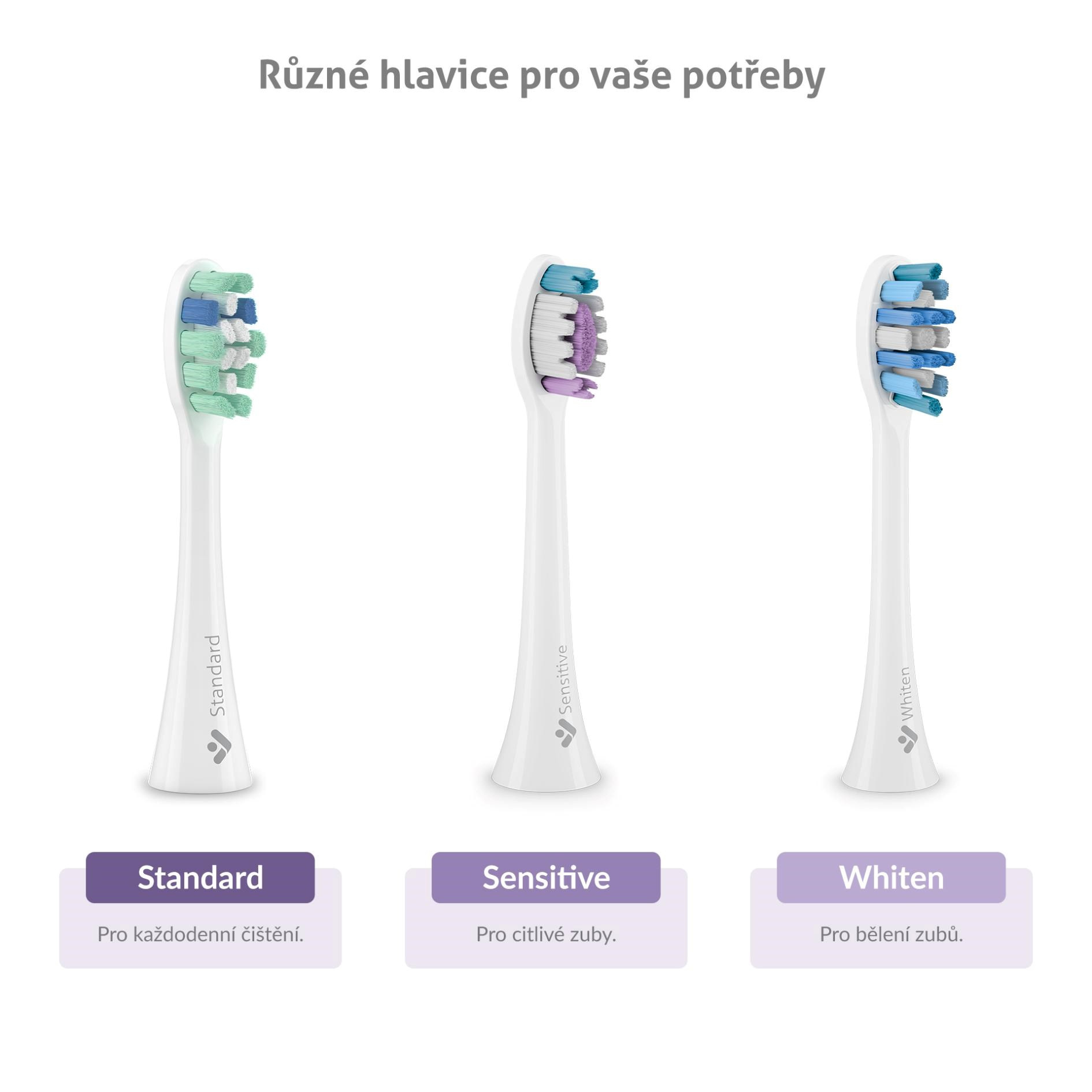 V balení nájdete pre každú kefku 2 náhradné hlavice, z čoho jednu využijete na každodenné čistenie (Standard), druhú na citlivé zuby (Sensitive). Na dokúpenie sú aj hlavice Whiten na bielenie zubov.