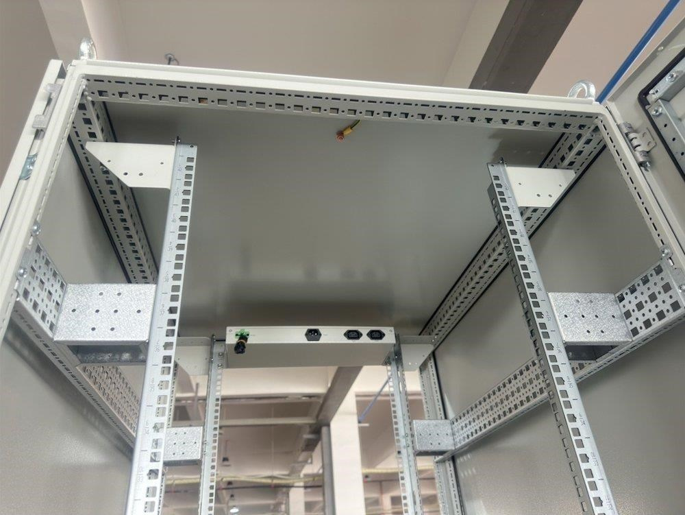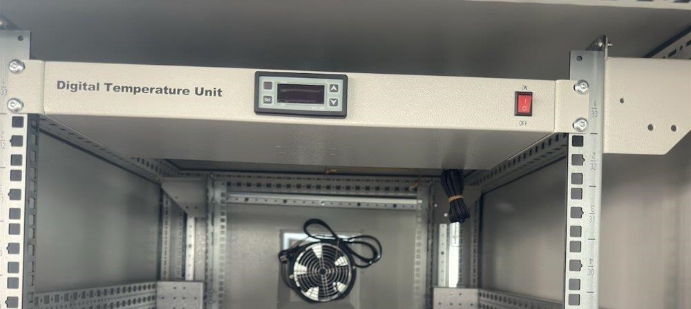 Rozvádzač pre inštaláciu dátových a telekomunikačných zariadení, ventiláciu s termostatom, podstavec, šedý.